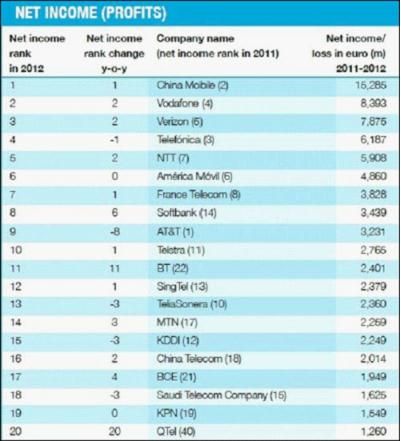 其中,中國移動凈利潤153億歐元,為全球最賺錢運營商,上一年,這個頭銜曾被AT&T取得,但今年AT&T利潤情況已降至全 球第9;按利潤情況排,第二至第四的運營商為英國沃達豐、美國Verizon、西班牙電信、日本NT&T。中國電信凈利潤排名全球第16名,僅次 于日本第二大運營商KDDI,上一年,中國電信凈利潤排名為全球第18。