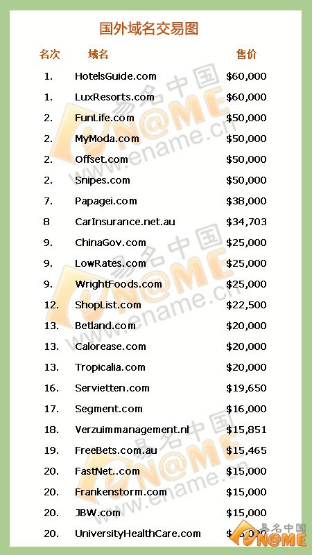 綜上所述,在國(guó)內(nèi)市場(chǎng),單拼雙拼域名齊來(lái)斗陣,價(jià)格交易不菲,海外的域名交易市場(chǎng)競(jìng)爭(zhēng)相當(dāng)激烈,不僅出現(xiàn)了2個(gè)冠軍,亞軍的寶座也是4個(gè)域名共享,就連“老九”的位置也有三個(gè)域名相持。