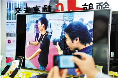 昨天下午,在深圳會(huì)展中心第十四屆高交會(huì)的4號(hào)展館海信公司的展臺(tái)前,一位正在拍照的記者被工作人員用手機(jī)拍照后馬上上傳到電視屏幕上。記者 李博 攝