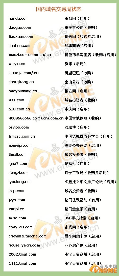 雙拼域名以它簡單易記的優(yōu)勢,在國內(nèi)一直非常吃香,本周也有多個雙拼域名被啟用和收購,南都網(wǎng)上新logo,百萬級身價域名nandu.com助陣,傳聞重慶公司五位數(shù)收購島國雙拼域名daoguo.com,“挑選”雙拼域名tiaoxuan.com以近30萬元的價格易主搭建海外代購折扣網(wǎng)站,淘寶天貓店粉色綿羊在易名中國交易收購了全套“帽子”域名maozi.com/.com.cn/.cn,等等。