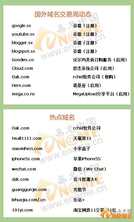 淘寶上演了一場雙11的神話劇使之無疑成為了本周的熱點,淘寶雙十一大促,僅一天時間,其支付寶交易總額就已達191億,而191億域名191yi.com立馬被電商人士龔文祥搶注。小米也在本周發(fā)布了自己的機頂盒小米盒子,四拼域名xiaomihezi.com/cn都被搶注。